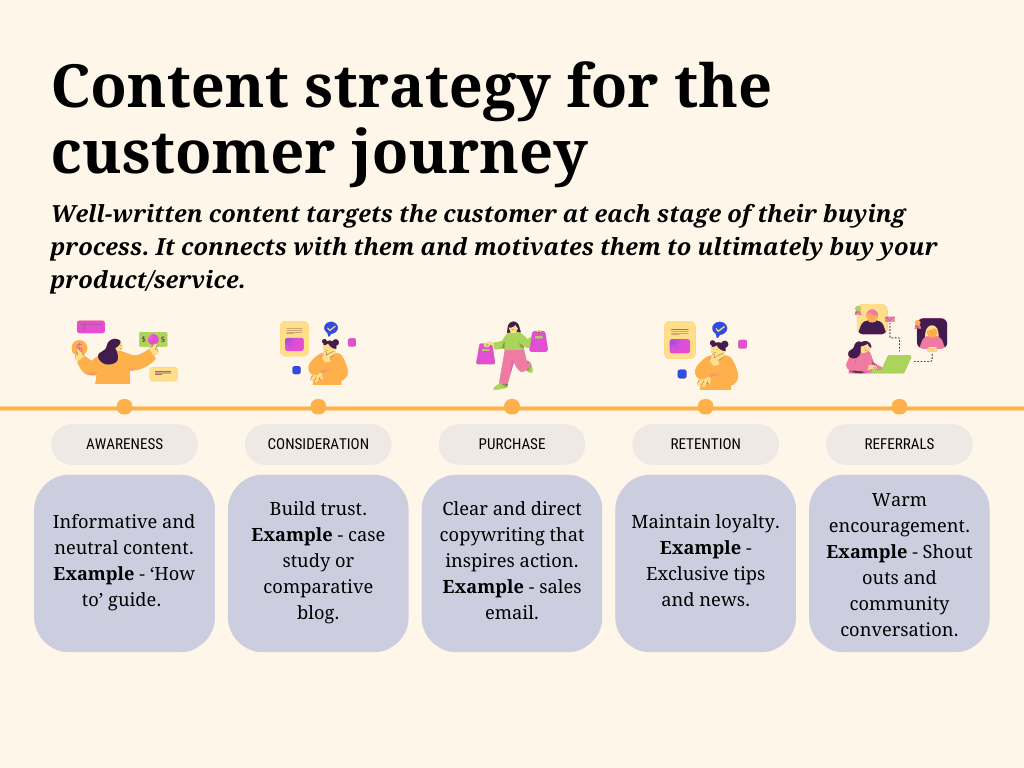 The best content meets the customer at their point in the buying journey. I’ve adapted a customer journey map to reflect content writing best practices – this can be used as a guide for precision targeting.