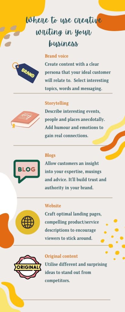 I’m not advising that you publish your personal poetry onto your business website but…it is another avenue for you to be creative. And remember, you can see what works and change it if it doesn’t land. Some of the key areas to be creative on a website are: landing pages, product/service descriptions and your About Me section.